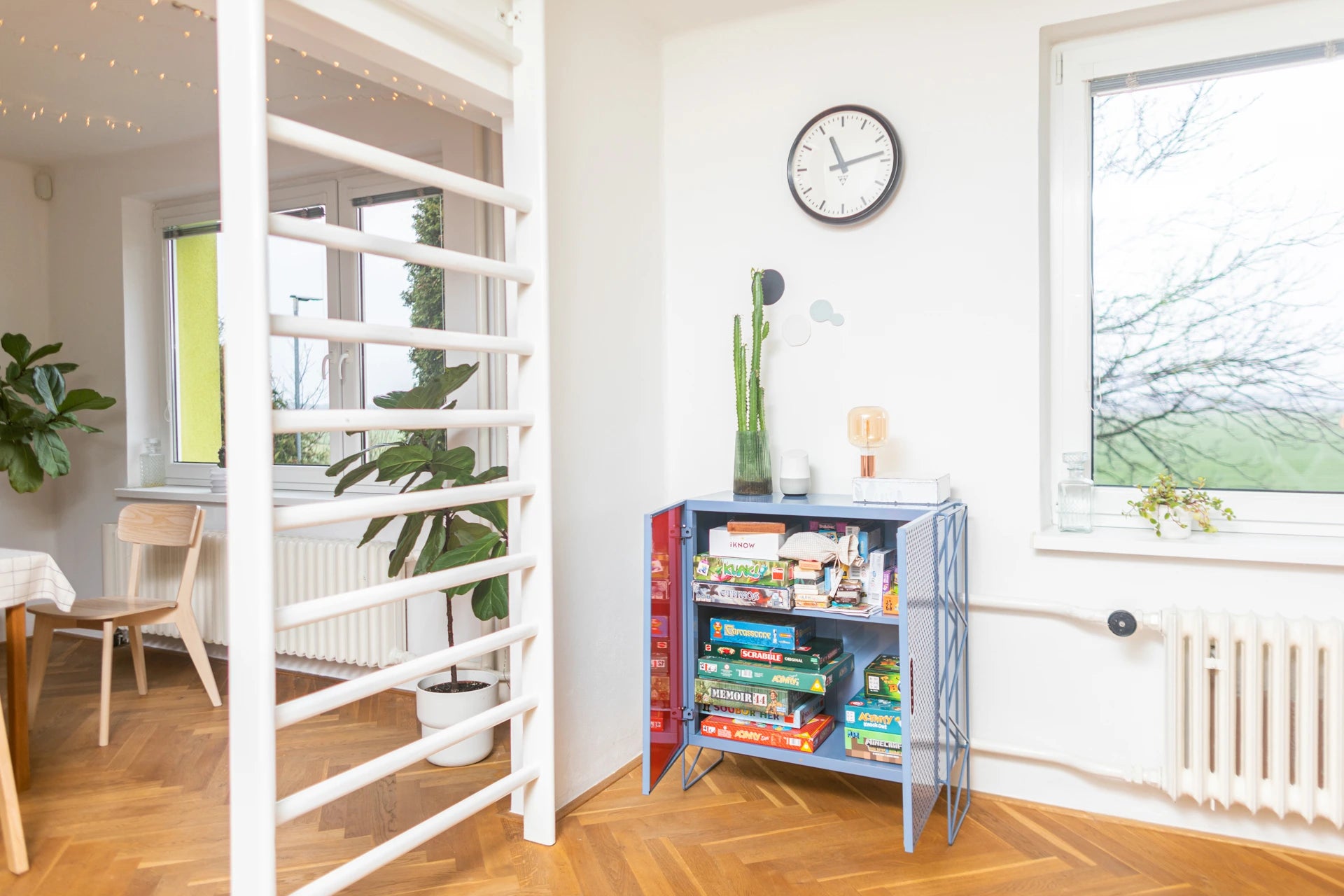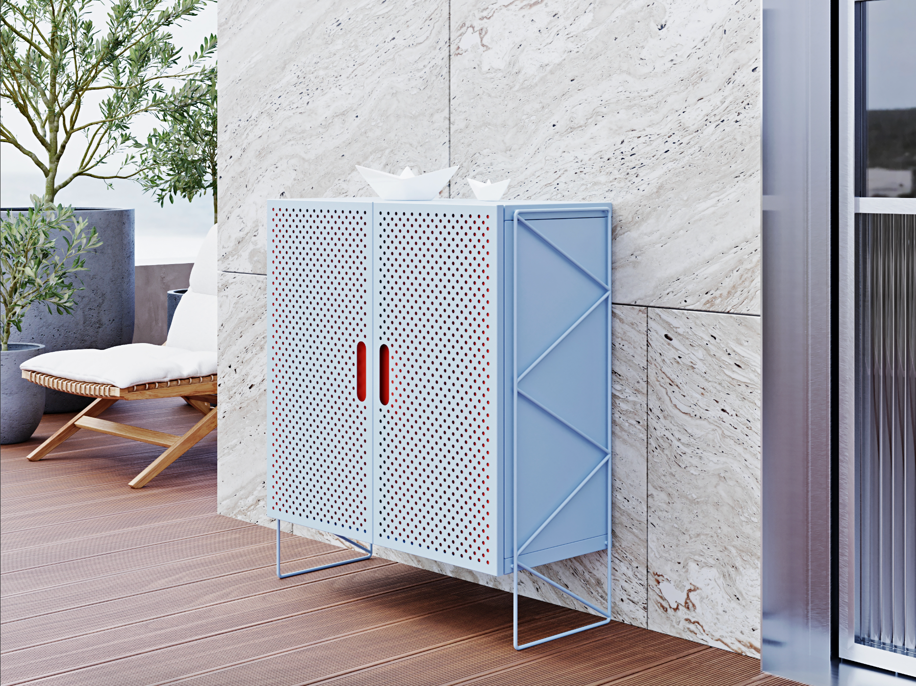 Myslím, že poprvé jsem na Fleysen narazila na Instagramu Nanovo, kam si chodívám pro inspiraci. Na první pohled mě značka zaujala barevností, hravostí tvarů, jednoduchými liniemi a perforováním. No a tahle skříňka byla láska na první pohled. Hned jsem věděla, na které místo v bytě ji dám, abych ji měla na očích. Ta barevná kombinace je krásná, nikdy by mě nenapadlo, že si modrá a červená budou takhle notovat.