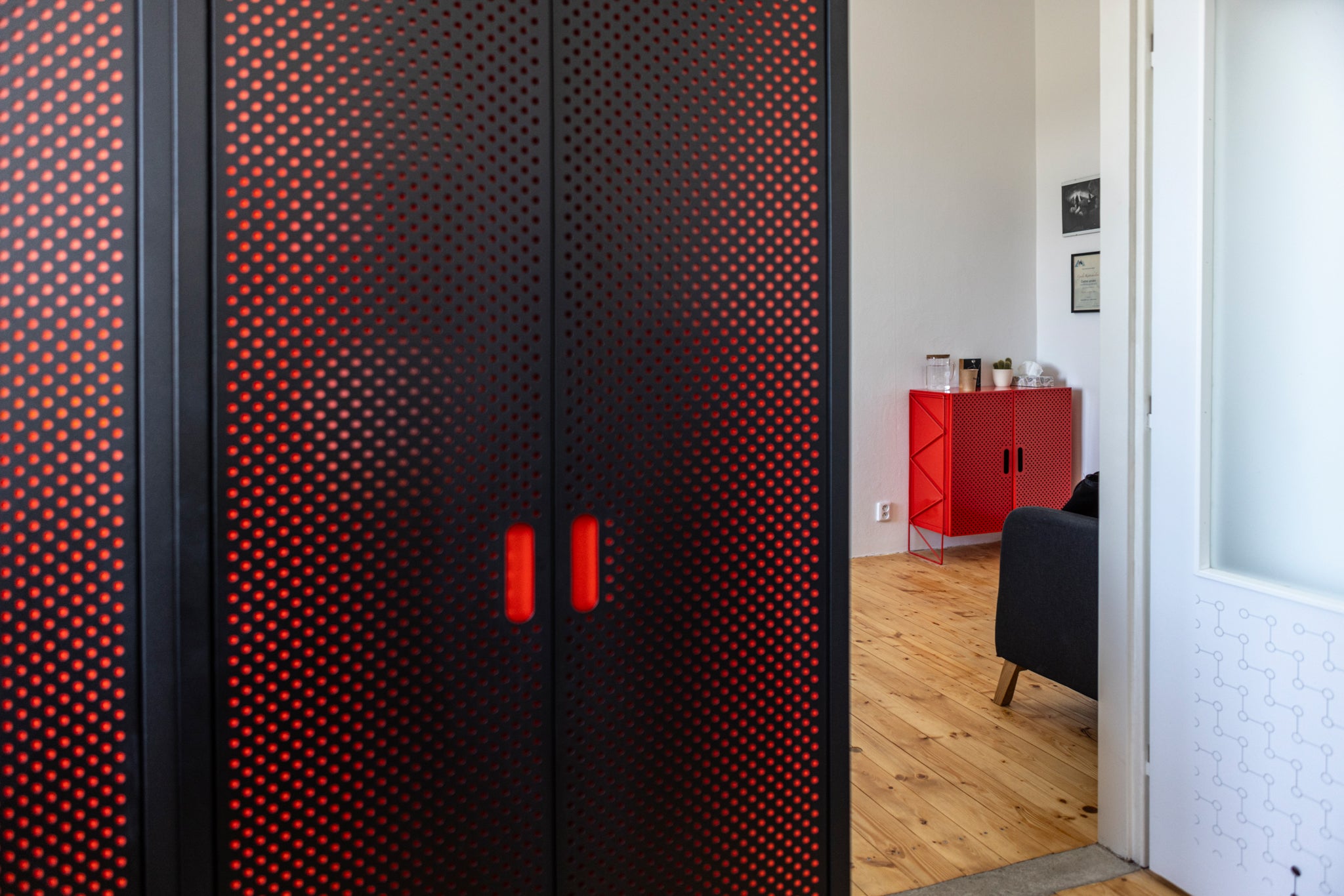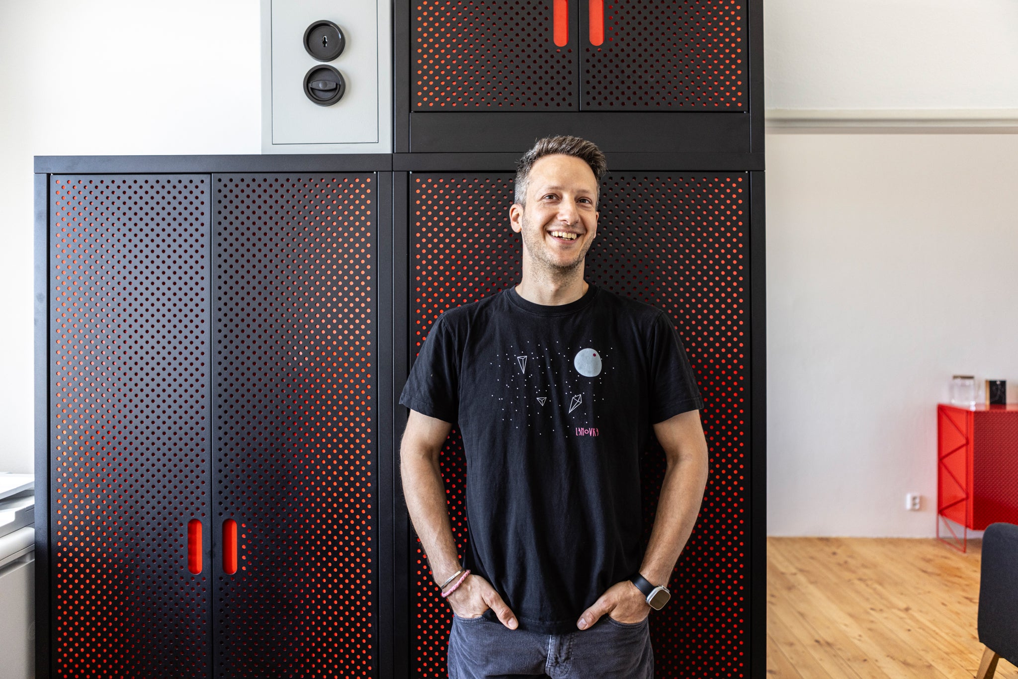 Důvodů, proč si Cyril vybral právě náš nábytek, bylo víc. Má vztah k architektuře a k historii, takže ho zaujal příběh naší továrny, hledal do interiéru jiný materiál než dřevo a v neposlední řadě šel cíleně po naší signature kulaté perforaci – kulatý tvar se totiž v prostorách Orla opakuje na mnoha místech.