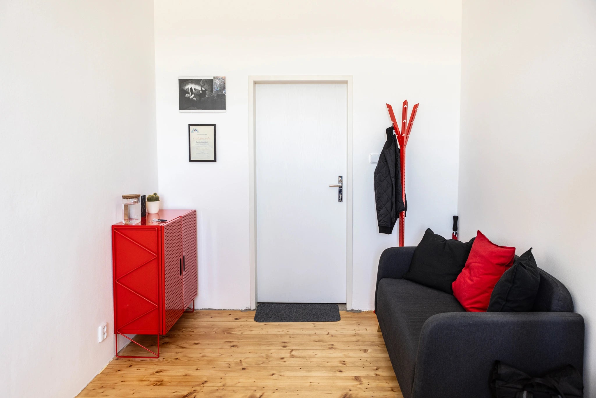 Zapadá sem tím, že je úplně jiný. Ke dřevěné podlaze jsme potřebovali odlišný materiál a nové barvy. A taky se nám sem hodí ta perforace s kolečky. Díry stejného tvaru jsou přímo na lezeckých stěnách a cíleně je opakujeme i jinde, např. na topení. Moje maminka je umělkyně a rovnou nám k tomu přinesla obraz s podobným motivem, takže se nám to postupně skládá.