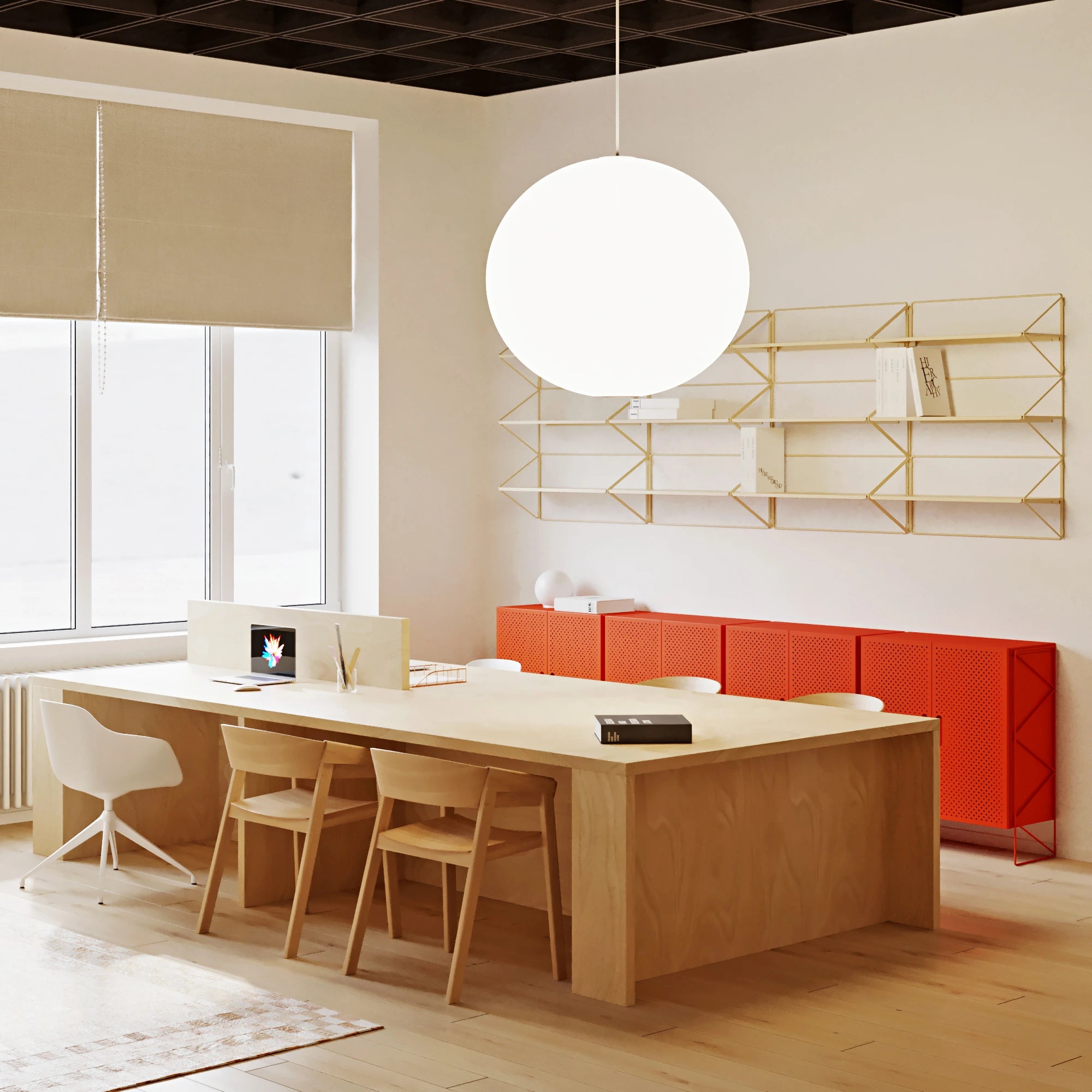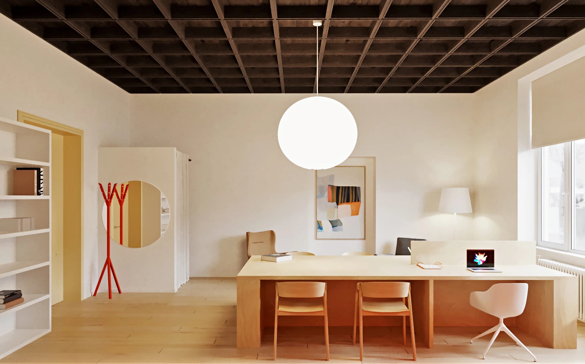 Jako výrazný barevný prvek byl vybrán teplý červený odstín, který dokonale doplňuje světlou dubovou dýhu a univerzální bílou. Výsledkem je světlá kancelář, která je díky ladícím barvám a setkáním minulosti se současností plná harmonie a inspirace.