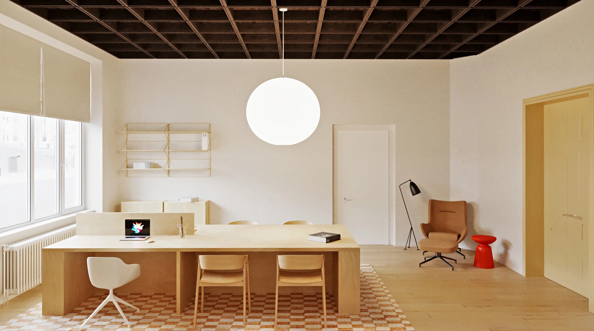 Kromě estetických požadavků museli designéři Fleysen Studia na ploše 38 m² vycházet i z těch praktických – bylo potřeba navrhnout interiér tak, aby vyhovoval dvěma lidem na práci, aby byl k dispozici prostor na schůzky a jako bonus se snažili do místnosti zakomponovat také menší relaxační zónu.