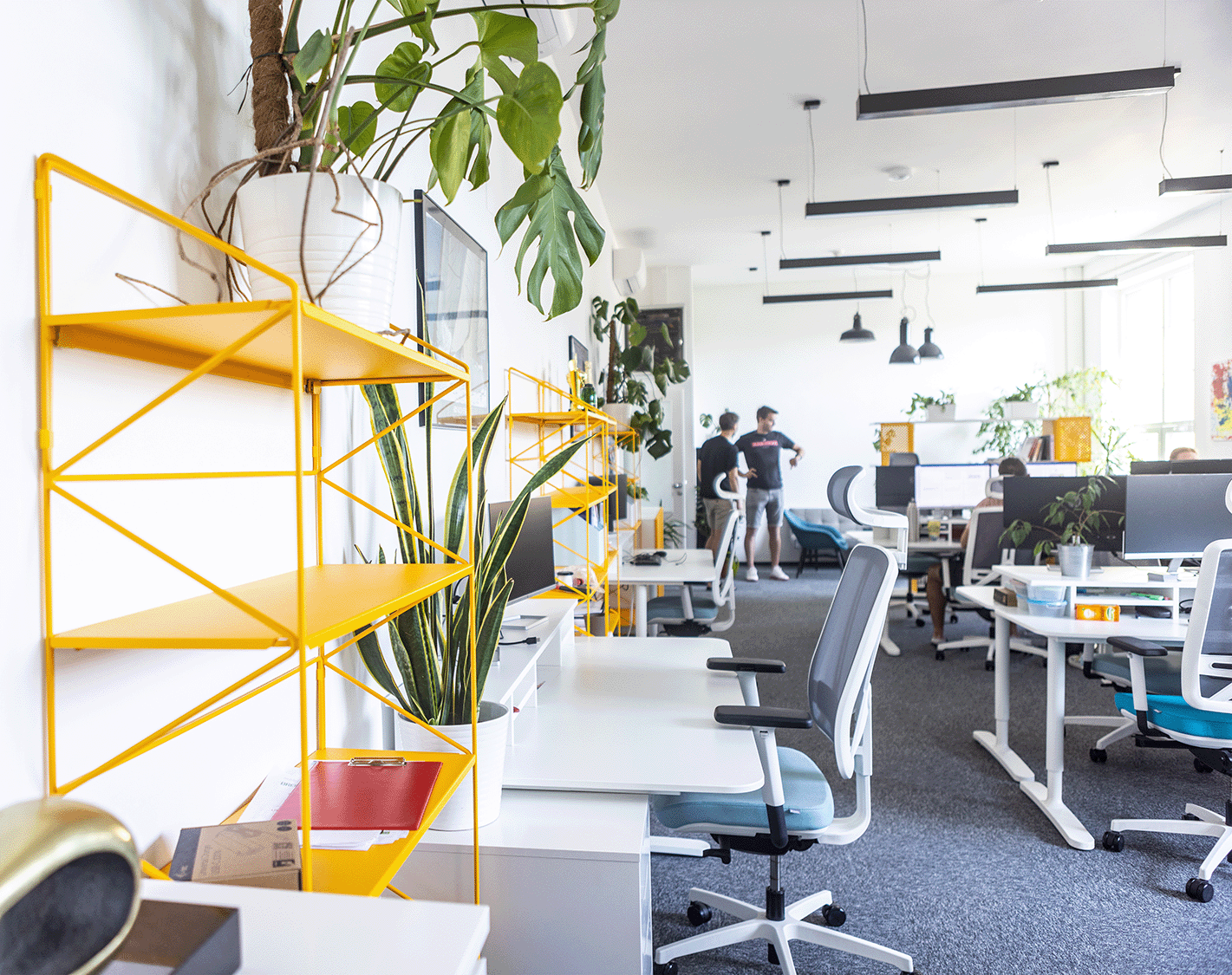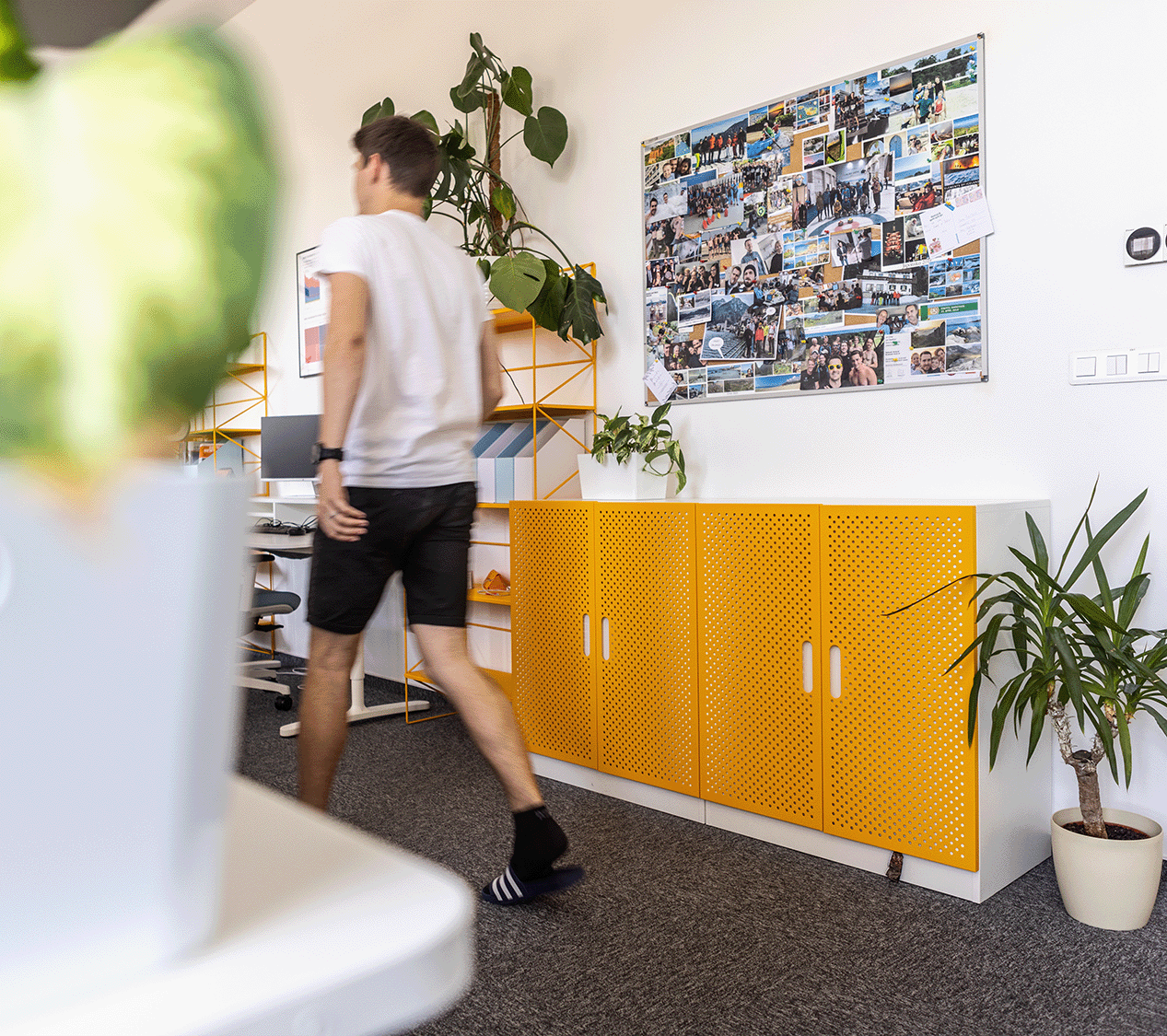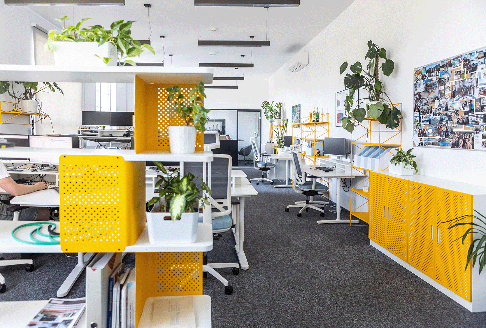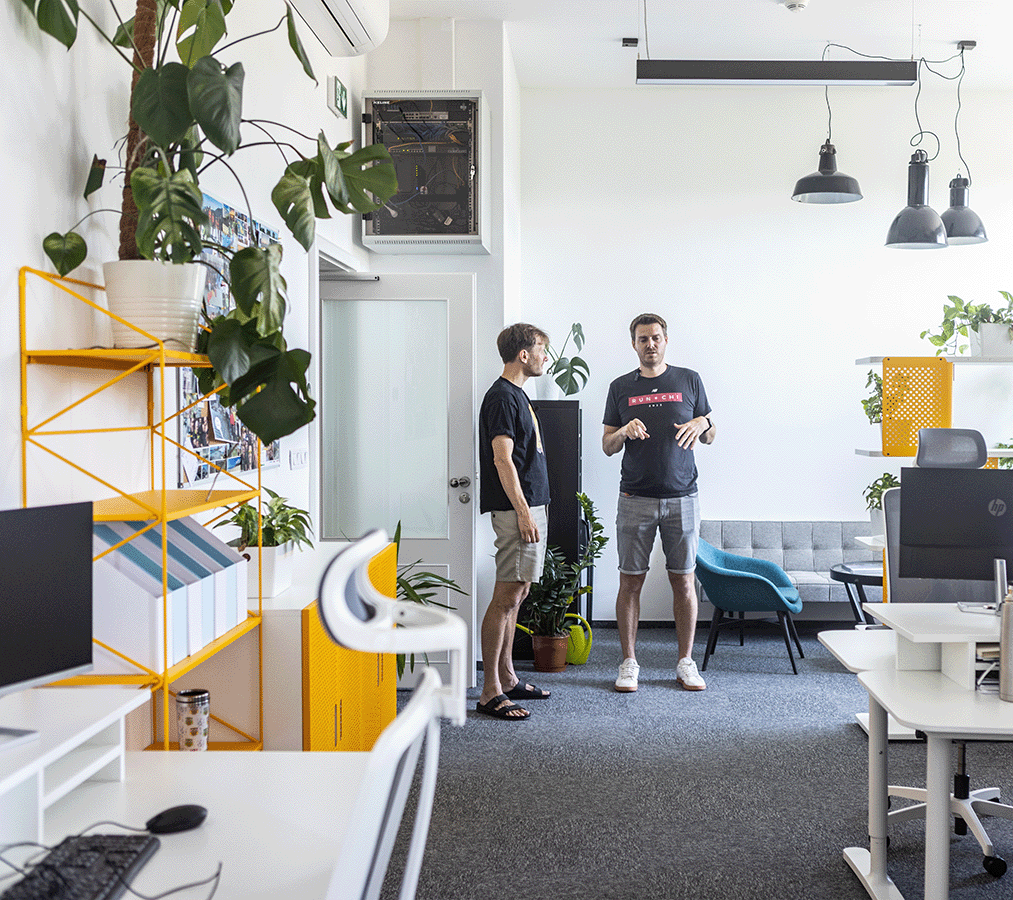 Chtěli jsme, aby naše kanceláře nebyly nudné. Všechny ty bílé standardní stoly nám připadaly příliš unylé. Už jsme měli koupené židličky v určitých barvách, a tak jsme hledali nějakou doplňkovou barvu – nakonec nás nadchla žlutá. Myslím, že to vyšlo skvěle, žlutá dodala celému prostoru energii.