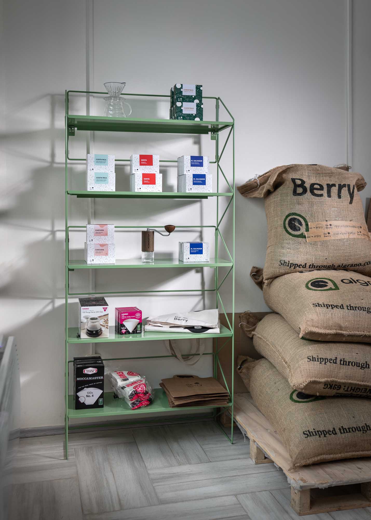 Kateřina zkombinovala kovovou perforovanou desku s naším bestsellerem, stojacím regálem #1210, a doplnila jimi promyšlený interiér svého domova. Na stejný regál v jiném odstínu můžete natrefit např. v kávovém showroomu pražírny BeBerry.
