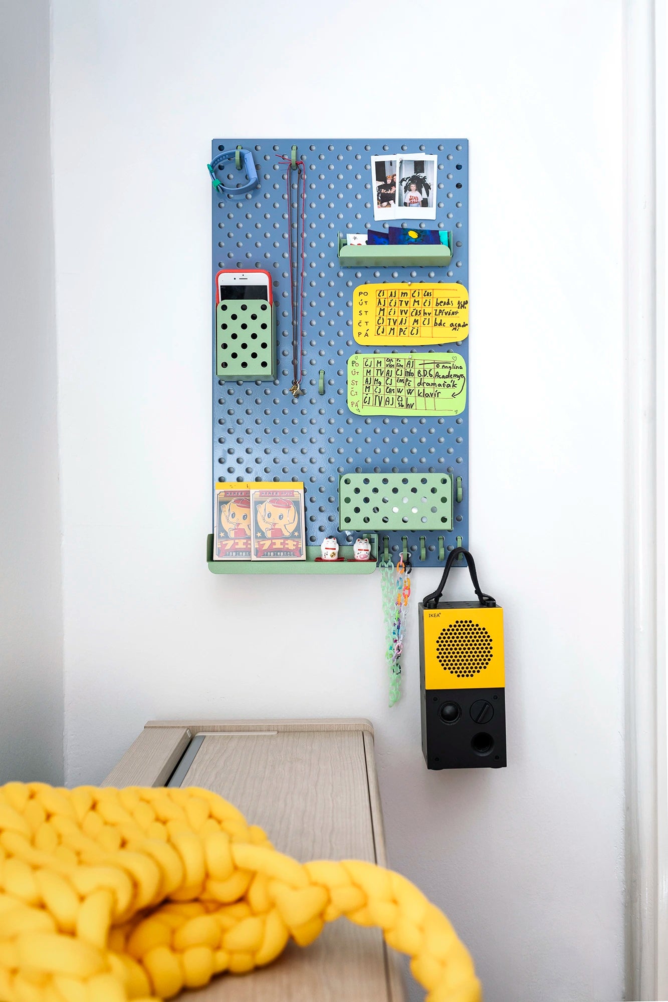 Das strapazierfähige Material hält den Spannungen bei Kinderspielen stand, ist häufigen Anpassungen gewachsen, lässt sich stufenlos variieren und lässt sich leicht abwischen . Dank der Perforation ist es möglich, verschiedene Gegenstände an der Tafel aufzuhängen und selbstverständlich ist sie magnetisch. Wir empfehlen, es gleich mit einem Set an Zubehör (Haken, Körbe und Regale) zu kaufen, und das Brett wird schnell zu einem Zuhause für Spielzeug, Schreibwaren, Papiere aller Art oder Schmuck.