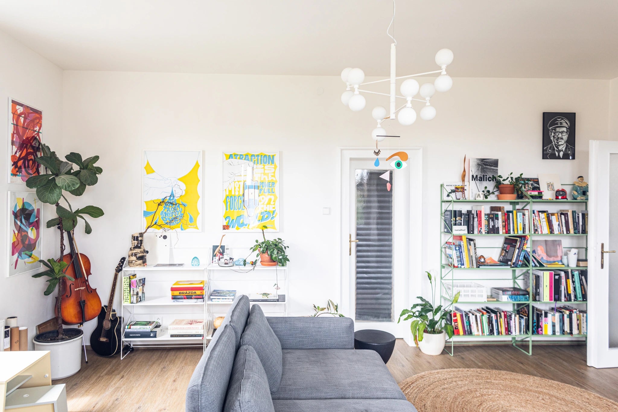 Die Fleysen-Metallregale gefielen Klara und Tomáš bereits auf der Designblok 2021, aber sie hatten zu Hause keinen Platz dafür und kauften sie daher erst, nachdem sie in ihre jetzige Wohnung eingezogen waren. Für sie waren die Farben, die Leichtigkeit und die einfache Montage die Hauptgründe, warum es sich gelohnt hat, fast zwei Jahre zu warten.
