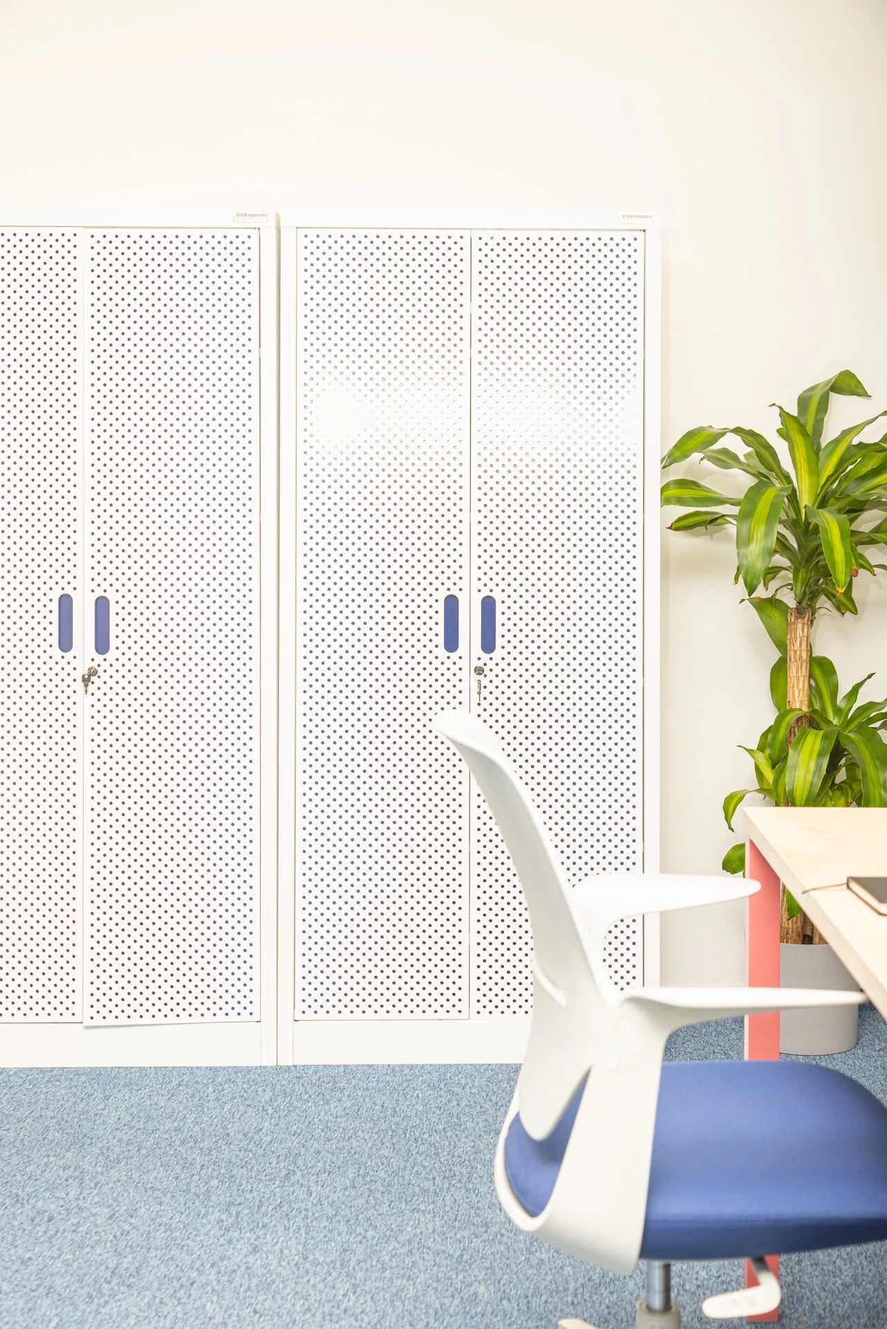 Wir haben einen modifizierten Schrank Nr. 2015 und ein farbiges Regal Nr. 1210 verwendet . Wir waren auf der Suche nach schlanken Metallmöbeln, die sich färben lassen. Ein weiterer Wunsch des Kunden war, dass es abschließbar sein sollte, und Fleysen kam uns diesbezüglich entgegen.