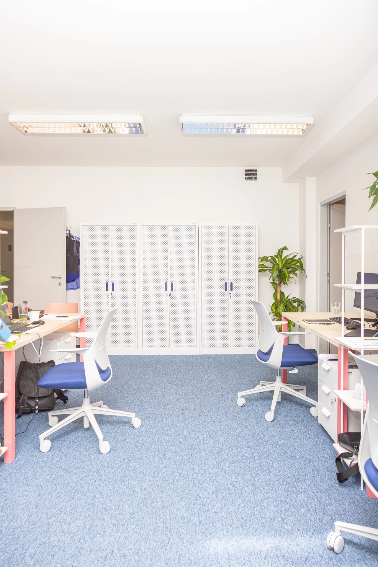 Neben der Einhaltung von Terminen und Budgets musste ungewöhnlich viel Lagerraum ins Büro gebracht werden, da viel Papier verbraucht wird. Manchmal erfüllen die Stauräume gleichzeitig eine Trennfunktion und trennen die Sitzbereiche. Außerdem weiß das Unternehmen nicht, wie lange es hier bleiben wird, daher haben wir auch nach etwas gesucht, das sich möglicherweise leicht bewegen lässt.