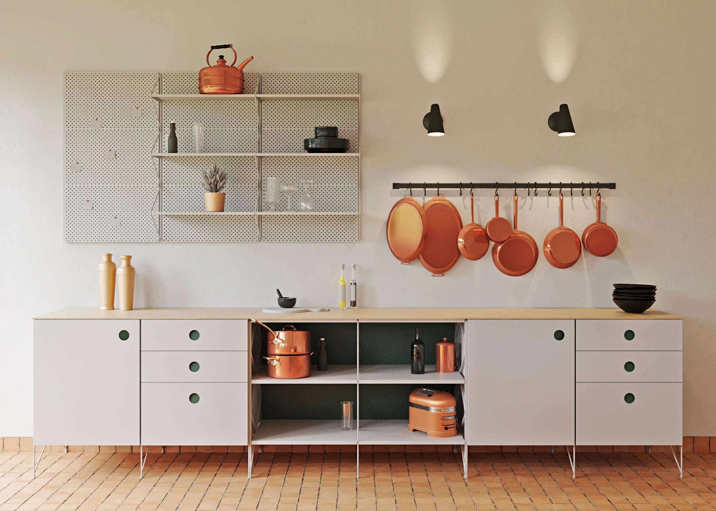 Die Küchenmöbelkollektion umfasst Hängeregale und variable offene und geschlossene Schränke. Das Konzept ist als Ergänzung zu einer voll ausgestatteten Küchenzeile oder für den gelegentlichen Gebrauch, z.B. zum Kochen, gedacht. in einem Ferienhaus oder in Kurzzeitmieten. Für diejenigen, deren Design sie so sehr begeistert, dass sie keine weiteren Möbel in ihrer Küche haben möchten, fertigen wir gerne eine maßgeschneiderte Küchentheke oder eine komplett maßgeschneiderte Küche.