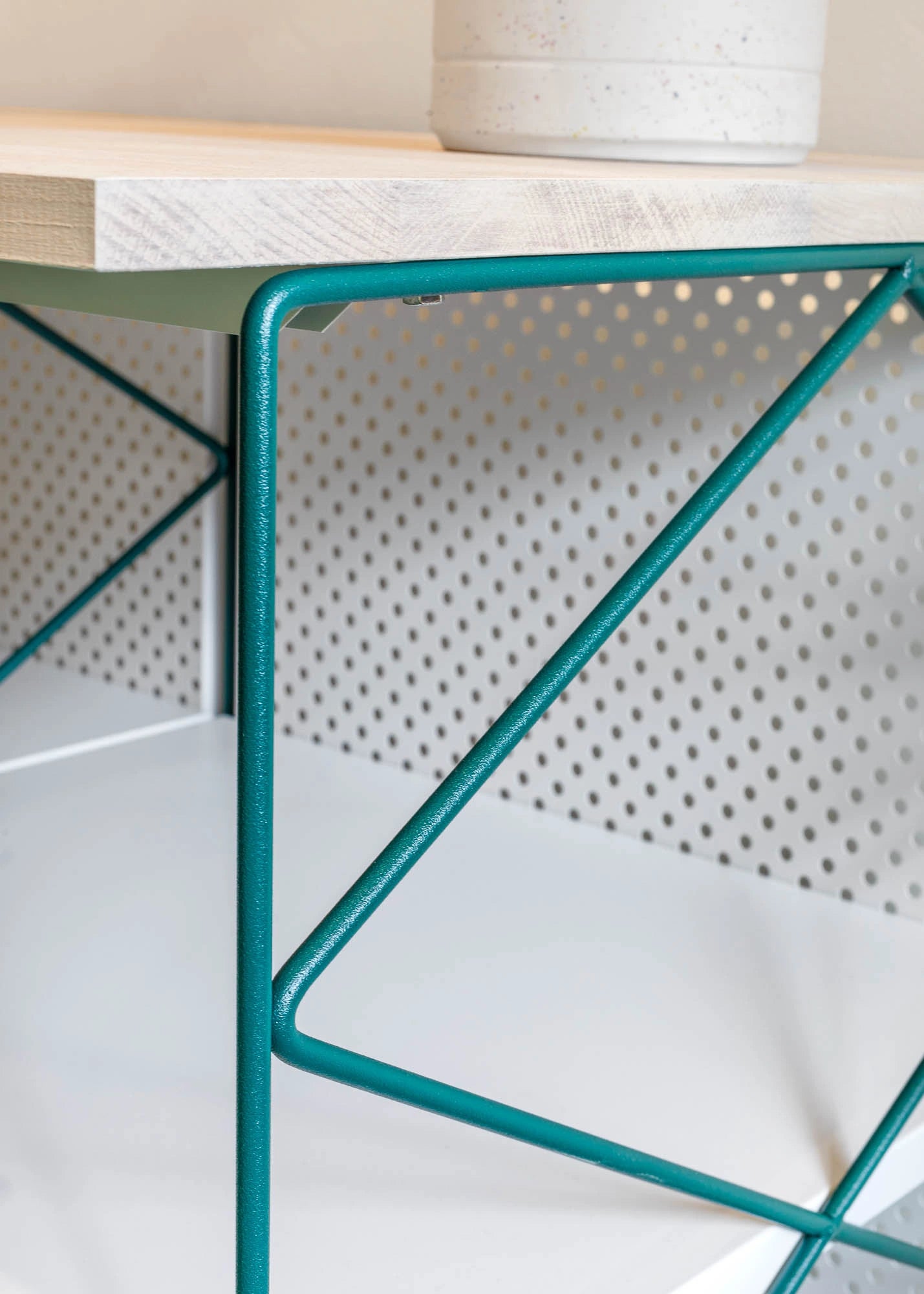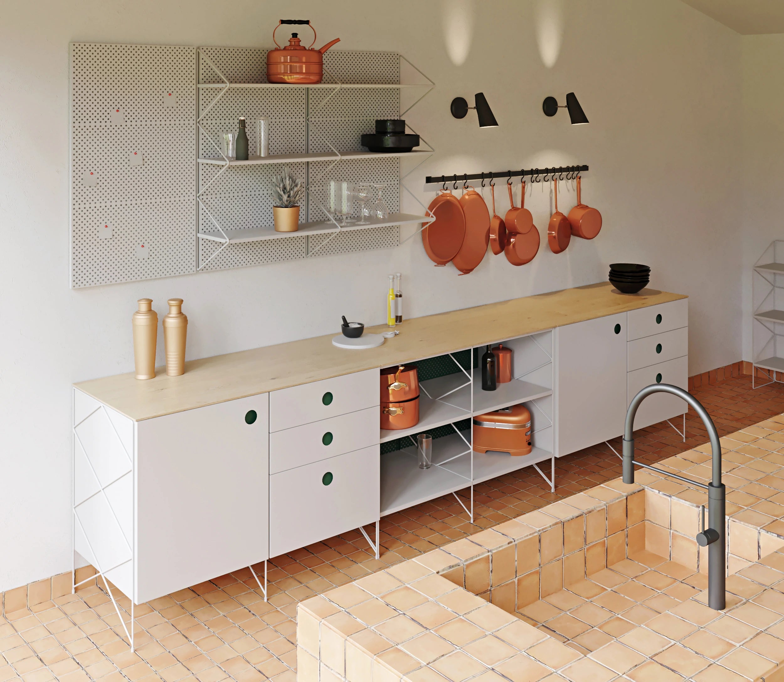Auch hier haben die Designer mit der Perforation gearbeitet, die langsam zu unserem Markenzeichen wird und dem Metallmaterial die nötige Luftigkeit verleiht . Dieses Mal entwickelten sie es auch zu einer Schrankgrifflösung. Die Griffe sind im Wesentlichen vergrößerte Löcher der klassischen Perforation. Zur Kollektion gehört auch eine perforierte Wandplatte , an der Haken für Werkzeuge und Dekorationen aufgehängt werden können.