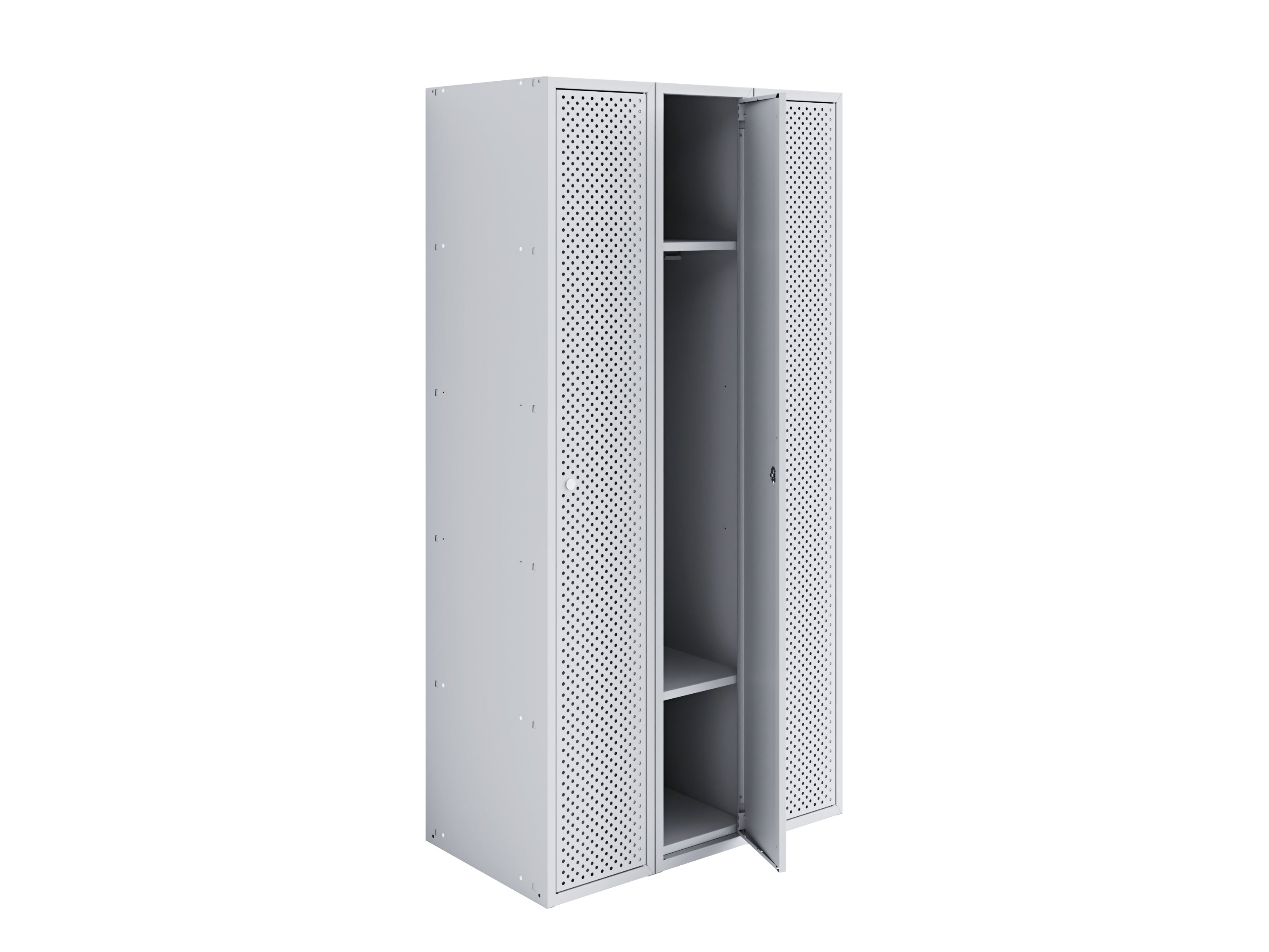 Elegantní skříňka zaujme dynamickým gradientem: dvířka tvoří dva plechy různých barev, přičemž vnější je perforovaný. Uvnitř jsou dvě police. Horní police je vybavena držákem na ramínka a háčky na poutka.