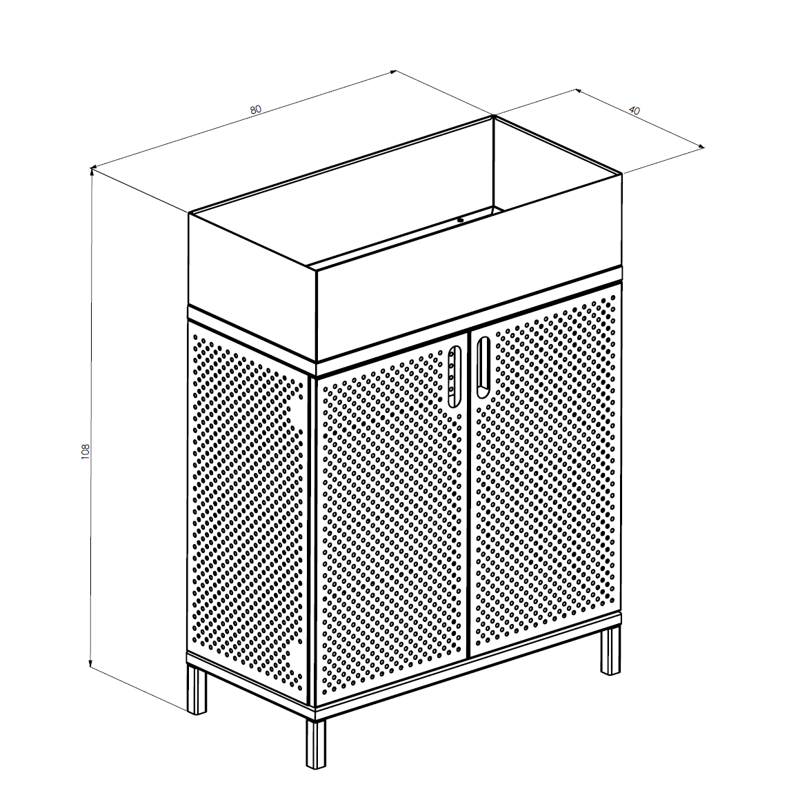 Designová skříňka s perforací po celém obvodu je navržena tak, aby si svou pohledovost zachovala ze všech stran a umožnila vytvářet samostatné ostrůvky v otevřeném prostoru. Perforace zajišťuje nejen praktické odvětrávání, ale zároveň působí jako výrazný vizuální prvek, který pracuje se světlem a stínem.