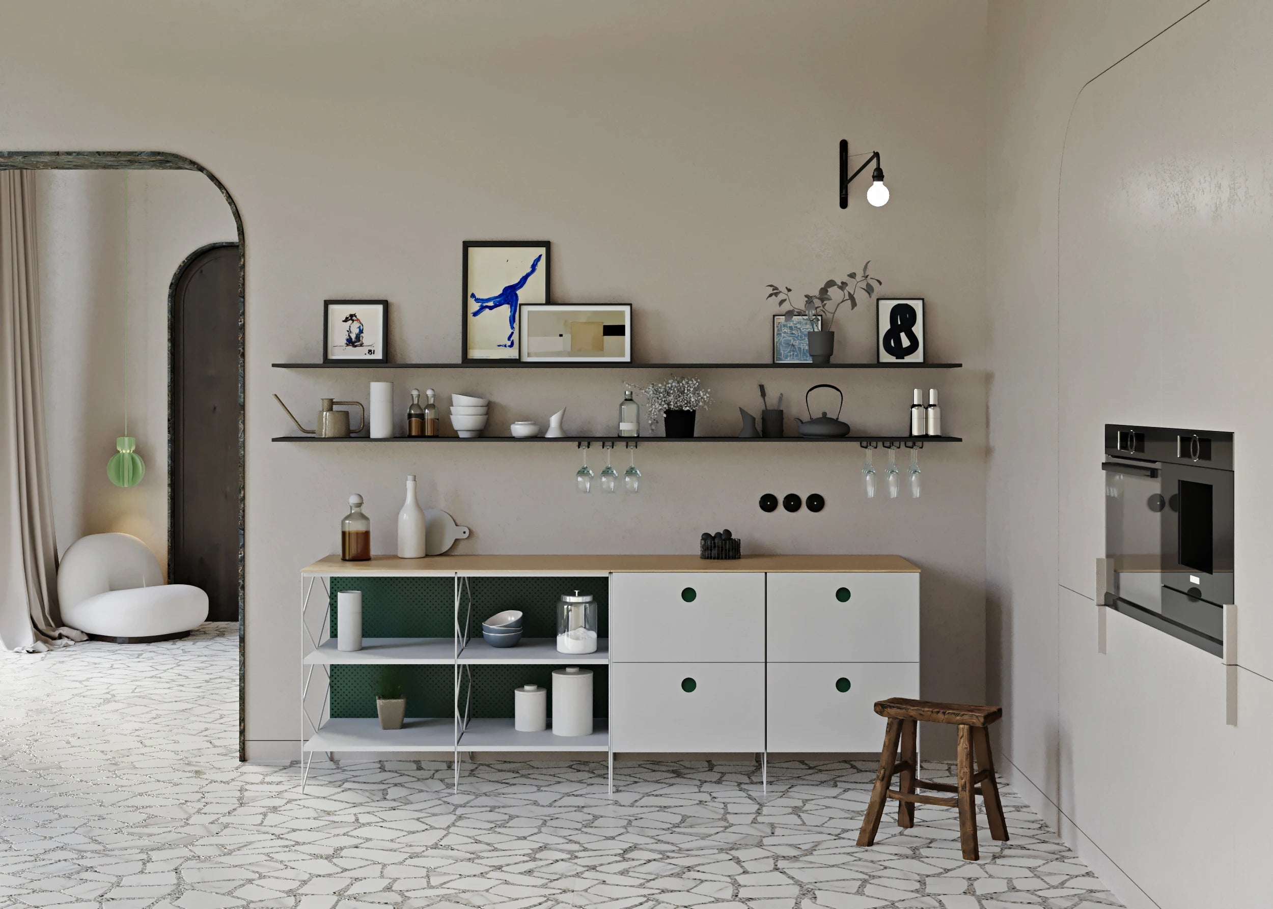 Tato kuchyňská skříňka kombinuje moderní design a praktičnost. Bílé kovové police jsou podepřeny tenkými kovovými nohami, které dodávají celkové konstrukci lehkost a eleganci.